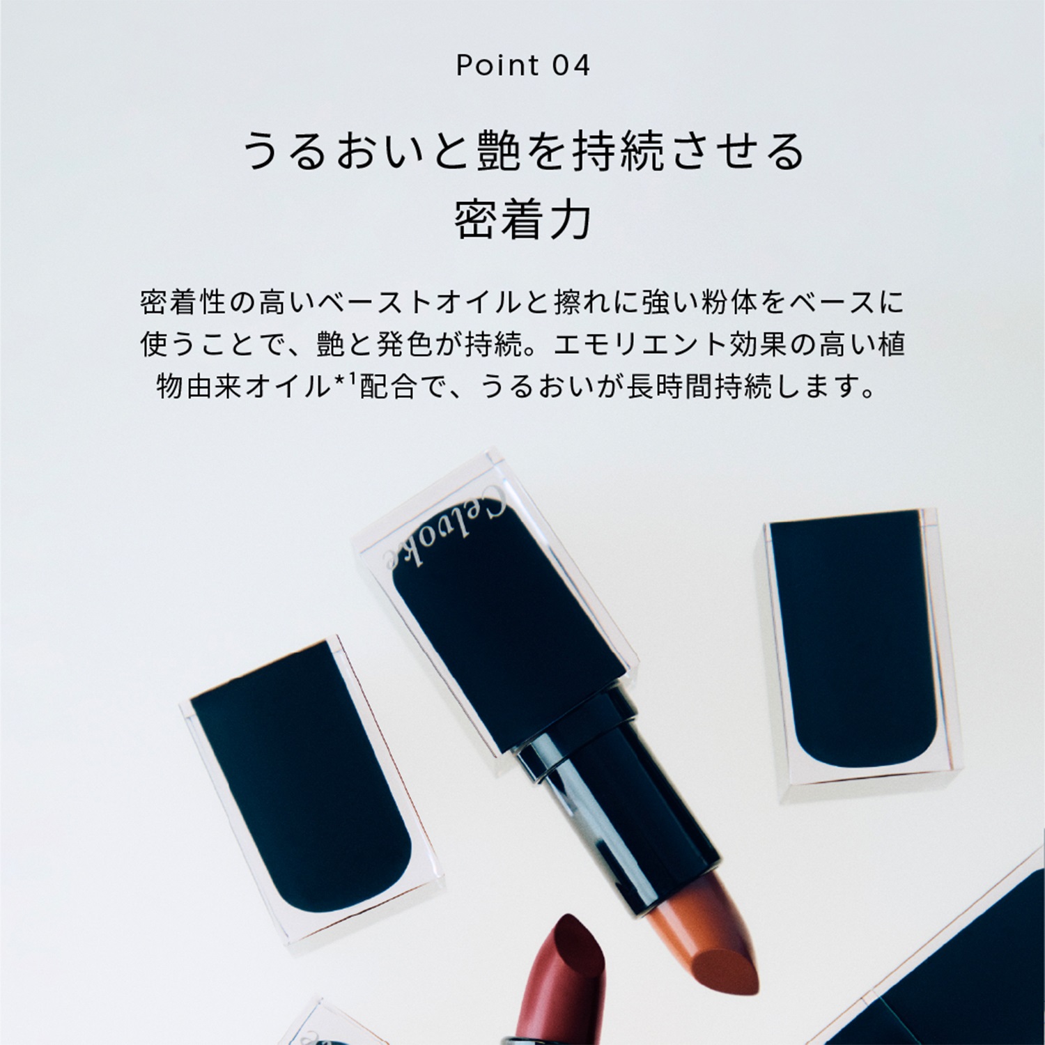 薄膜を作るオイルとワックス、板状粉体のミックスにより、唇そのものが色づいたような均一発色を叶えます。ムラづきしない重ねやすさにもこだわり、塗るほどにこっくりと色の存在感を高めていくことができます。