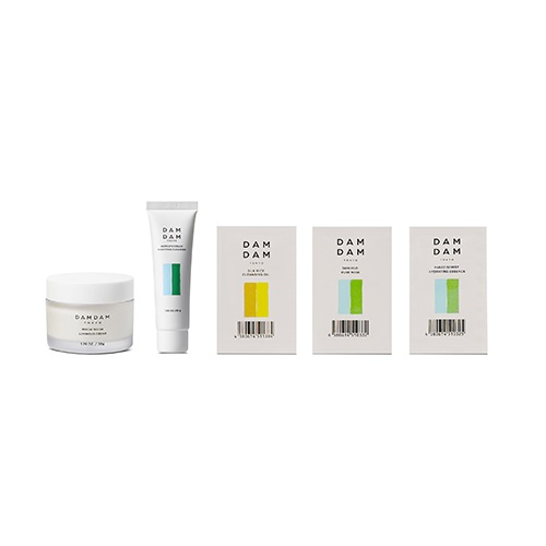 DAMDAM WINTER KITはもちもちルミナスクリーム現品に価格そのままで、1週間ほどお試しできるこんにゃくスクラブ入り洗顔のミニサイズ、スキンケアルーティンを体感できるクレンジングオイルと泥パック、化粧水のサシェ各1枚、計3枚を限定カラーのロゴ入り巾着に入れてお届けします。