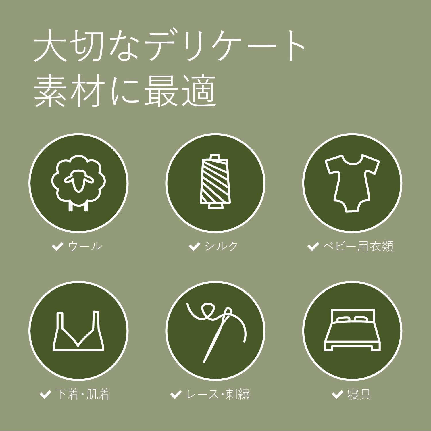 チクチクしやすい冬場のニットやマフラー、帽子なども、ふわっと仕上がります。レースやシルクなど、傷付けたくない素材も優しく洗い上げます。