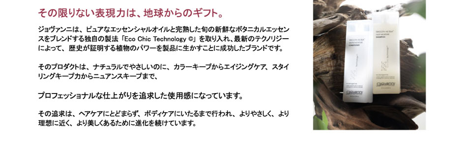 ジョヴァンニは、ピュアなエッセンシャルオイルと完熟した旬の新鮮なボタニカルエッセンスをブレンドする独自の製法「Eco Chic Technology」を取り入れ、最新のテクノリジーによって、歴史が証明する植物のパワーを製品に生かすことに成功したブランドです。