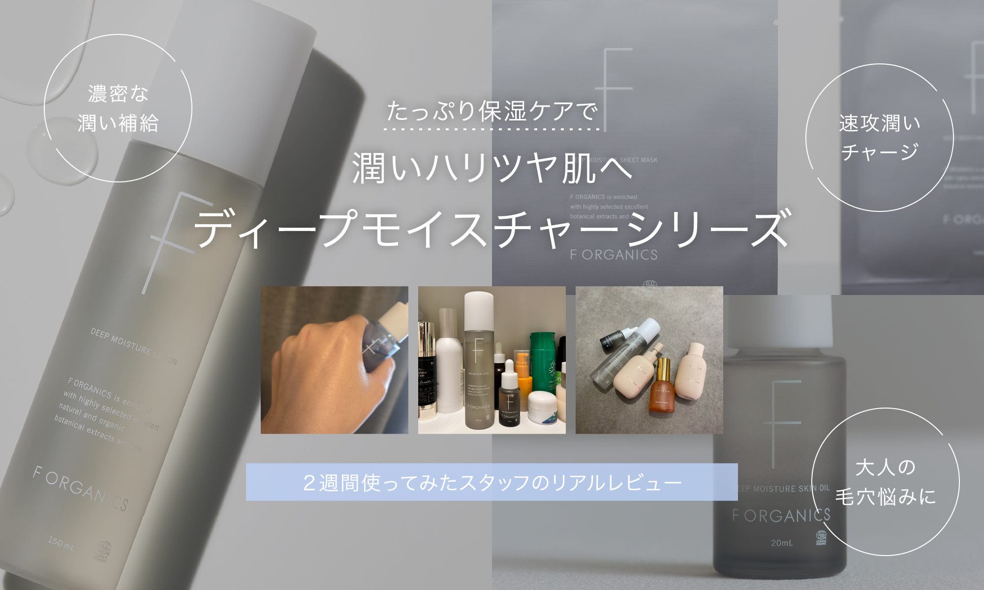 乾燥対策できていますか? 保湿といえば ディープモイスチャーシリーズ! 2週間使ったスタッフの リアルなレビューを肌質別にご紹介♪ REVIEW1 REVIEW2 REVIEW3 乾燥肌 混合肌 敏感肌 REVIEW1 大崎さん(24歳) 乾燥肌 最近の肌悩みは「乾燥」「シミ」「毛穴」の3つ。 乾燥するとゴワついて敏感になり、皮むけしてしまうことも。 冬のスキンケアのこだわりポイント 刺激の少ないアイテムをベースに、「保湿」「シミ対策」「毛穴ケア」をテーマに複数のアイテムを常備。その時々の肌状態や気分に合わせて、その日使うスキンケアを決めています。冬はやっぱり保湿系のアイテムに手を伸ばしがち。乾燥は夜中よりも日中の方が気になるので、朝からオイル美容液や重ためのクリームを使います。 ディープモイスチャーシリーズ おすすめのアイテム おすすめアイテムはローション! F ORGANICSの化粧水は、一年を通してスキンケア棚に常備!“保湿といえば”の大人気アイテムなので絶大な信頼があります。 とろみのある質感で、1プッシュでモッチモチな肌にしてくれます。乾燥でゴワついている部分や肌荒れ中の部分にもスッと浸透※1してくれるので、どんな肌状態の方にもおすすめしたいアイテムです♪ ※1 角質層まで PICK UP ITEM 化粧水 【F ORGANICS】ディープモイスチャーローション 150ml / ¥4,180(tax in) シートマスク 【F ORGANICS】ディープモイスチャーシートマスク 1枚 / ¥880(tax in) 4枚 / ¥3,300(tax in) 美容液 【F ORGANICS】ディープモイスチャースキンオイル 20ml / ¥5,720(tax in) クレンジング 【みんなでみらいを】米ぬか洗顔クレンジングパウダー 70g / ¥2,035(tax in) 美容液 【VT】VT シカナチュラルリードルS 50 50ml / ¥3,270(tax in) 美容液 【MARTINA】アイケアクリーム 15ml / ¥3,850(tax in) 2週間ディープモイスチャーシリーズを 使用して感じたお肌の変化は? シリーズで使うと、保湿感だけでなく、キメが整って毛穴が目立たない肌になったと感じました!新たなお気に入りはフェイスマスク。一回使ってみたら、潤ってつるんと毛穴をケアしてくれて感動! 大切な日の前は必ず使いたいと思いました♡ 乾燥して ごわつきがちなお肌 潤いチャージして キメの整ったお肌 関連商品 乳液 【F ORGANICS】ディープモイスチャーミルク 120ml / ¥4,180(tax in) クリーム 【F ORGANICS】ディープモイスチャークリーム 40g / ¥5,170(tax in) メイク落とし 【F ORGANICS】ディープモイスチャークレンジングクリーム 150g / ¥4,180(tax in) 洗顔料 【F ORGANICS】ディープモイスチャーフォーミングウォッシュ 150ml / ¥3,520(tax in) REVIEW2 片貝さん(33歳) 混合肌 乾燥からくる過剰な油分の分泌で30代になっても常に吹き出物などの肌トラブルが絶えない。スキンケアはいろんなものをつけすぎず、シンプルに。を意識しています。 冬のスキンケアのこだわりポイント 保湿を気にしすぎて、オイルやクリームなど重たいテクスチャーのものを重ねてつけたくなるのですが、自分の肌の“自ら潤う力”が損なわれない程度に化粧水・バームくらいで終わらせることが多いです。 ディープモイスチャーシリーズ おすすめのアイテム 特にスキンオイルがお気に入りで、夜だけでなく朝のスキンケアにも取り入れられるのでこの冬は手放せないアイテムです!社内の中でも特に肌が綺麗な人はディープモイスチャーシリーズ愛用率が高い印象だったのですが、納得の使用感!化粧水は、すーっと肌に浸透※1していく感覚が心地よく、さらに乾燥が気になる部分にオイルを重ねると、翌朝の肌のみずみずしさはもちろん、キメが気にならないくらい肌が元気でメイクのりも良く感じました! ※1 角質層まで PICK UP ITEM 美容液 【F ORGANICS】ディープモイスチャースキンオイル 20ml / ¥5,720(tax in) 化粧水 【F ORGANICS】ディープモイスチャーローション 150ml / ¥4,180(tax in) バーム 【trilogy】エブリシングバーム 45ml / ¥2,970(tax in) 2週間ディープモイスチャーシリーズを 使用して感じたお肌の変化は? 特に額にトラブルが起きやすく、常に赤く小さいプツプツができている状態だったのですが、ディープモイスチャーを数週間朝・夜使い続けるうちに気にならなくなってきた気がします! 過剰な油分分泌で トラブルのあるお肌 肌トラブルが 気にならなくなったお肌 関連商品 シートマスク 【F ORGANICS】ディープモイスチャーシートマスク 1枚 / ¥880(tax in) 4枚 / ¥3,300(tax in) 乳液 【F ORGANICS】ディープモイスチャーミルク 120ml / ¥4,180(tax in) クリーム 【F ORGANICS】ディープモイスチャークリーム 40g / ¥5,170(tax in) メイク落とし 【F ORGANICS】ディープモイスチャークレンジングクリーム 150g / ¥4,180(tax in) 洗顔料 【F ORGANICS】ディープモイスチャーフォーミングウォッシュ 150ml / ¥3,520(tax in) REVIEW3 柿本さん(27歳) 敏感肌 皮膚が敏感で、水分保持力が弱い。特に乾燥した空気や刺激を受けると、頬や鼻周りがヒリついたり赤くなったりすることがある。毛穴が目立ちやすく、化粧ノリにムラが出ることも悩みの一つ。 冬のスキンケアのこだわりポイント 水分不足にな