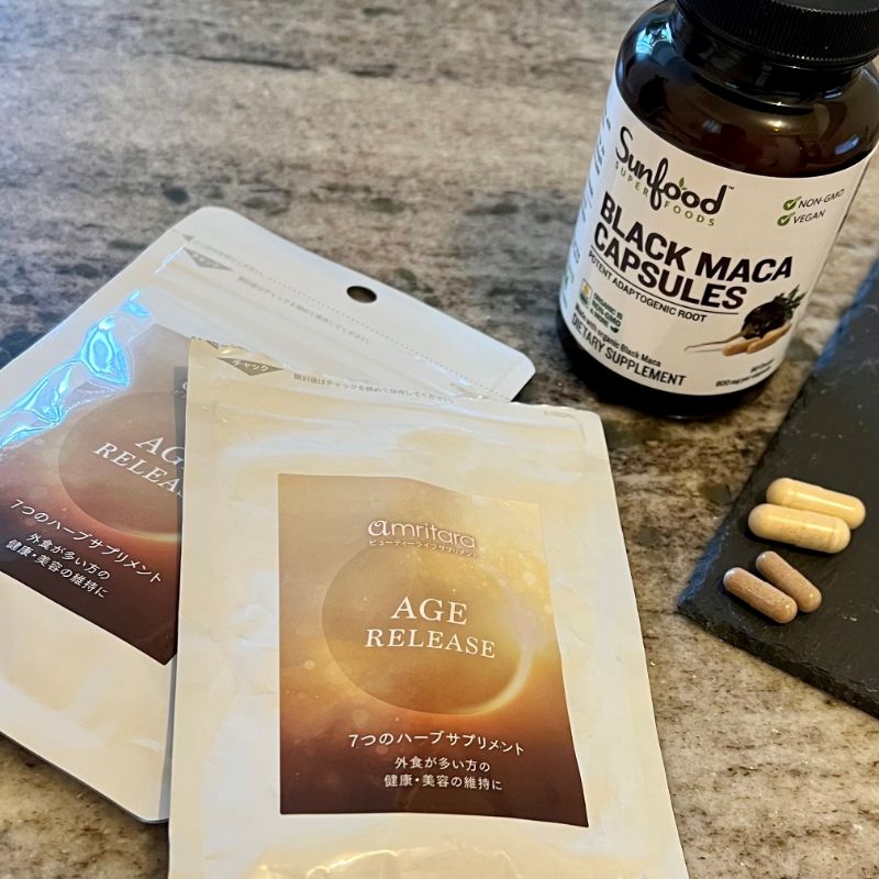 あと必ず食前にその日の体調に合わせてamritaraのエイジリリースかSunfoodのブラックマカを摂取しています。
