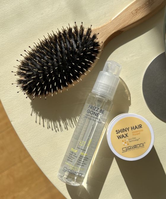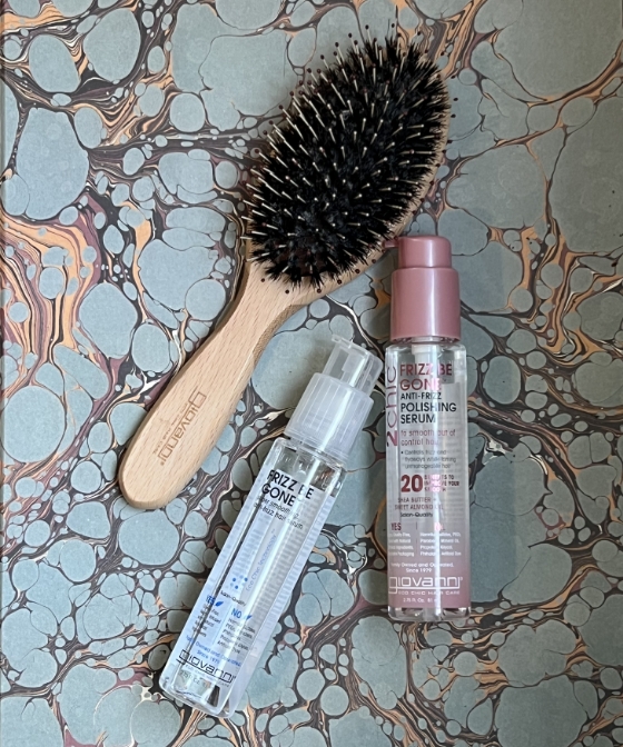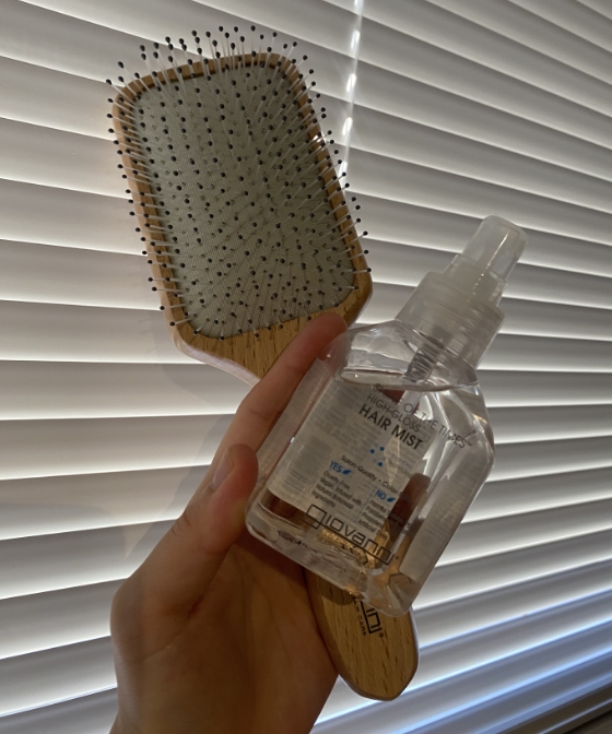 スタイリングには、シャインオブザタイムスグロッシーヘアミストとパドルブラシを愛用。
