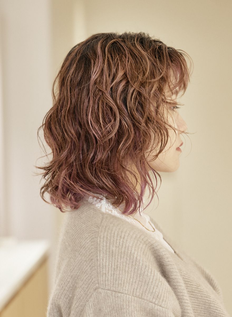髪が乾燥してゴワゴワしがちなカラーヘアにも、うるおいが行き届くイメージ。スタイリングにはフリッズビーゴーン スムージング ヘアセラムとシャイニーヘアワックス バレンシアフォレストを使用。