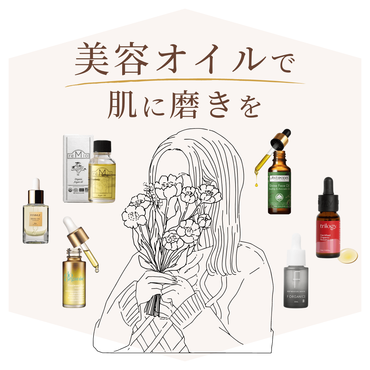 ≪オイル美容≫が気になっているけど、種類が多くてどれが合うのかがわからない! 化粧水や乳液、クリームといつも通りのケアをしているのに、 なんとなくうるおいが足りない… オイリー肌で「私はちょっと…」という方も必見。 乾燥し始める冬に向けて今から≪オイル美容≫にチャレンジしてみては? オイル美容液の効果って?どんな肌質におすすめなの? オイル美容液なし 乳液・クリームを使っているのに乾燥する。化粧してもファンデーションが浮いてしまう。 オイル美容液あり オイルがフタをして水分蒸発を防ぎ、肌を柔らかく滑らかにしてくれます。 オイル美容液のメリット 植物オイルは、エイジングケアに欠かせないビタミンEを豊富に含み いつまでも若々しいツヤを与えます。 お顔はもちろんのこと、頭皮や お風呂上がりの全身に塗布することができます。 オイル美容液の塗り方 ~正しいのはどっち!?~ Q 素肌に塗布する?化粧水の後? A 化粧水で整えた後に使用することを推奨いたします。 Q その理由は? A 化粧水はお顔全体の角質層を整え、次に塗布するアイテムをスムーズに運ぶ「運び屋」的存在。もしも肌が荒れたり、疲れたりすると、思うように美容成分がなじまなくて、もったいないことに。効果的に使う意味でも化粧水の後のご使用をお薦めいたします。 Q 一日一回の塗布で良い? A 多くの商品は、朝と夜のご使用をお薦めしています。朝はキメを整えるため、夜は寝ている間の乾燥や肌荒れを整えるため。肌が慣れてきたらたっぷりと塗布するのも人気の使い方です。 Recommended Item タイプ別おすすめアイテム 美容オイルを4つのカテゴリに分類しご提案させていただきます。お肌に合う美容オイルを是非、お試しください。 毛穴ケア くすみケア オイリー肌 美容オイルブースター 毛穴ケア #毛穴ケア#乾燥・保湿#キメ#肌のざらつき#王道オイル 【trilogy】ローズヒップオイル ¥3,740 tax in BUY #毛穴ケア#乾燥・保湿#べたつかない 【F ORGANICS】ディープモイスチャー スキンオイル ¥5,720 tax in BUY くすみケア #ダメージケア#ハリ#全ての肌タイプ 【Antipodes】ディバイン アボカド&ローズヒップ フェイスオイル ¥4,950 tax in BUY キャンペーンページはこちら #モチモチ肌#べたつかない 【FRENAVA natural&organic】エモリエントオイル ¥6,600 tax in BUY #乾燥肌#くすみケア#ゆらぎ#べたつかない 【DAMDAM】バランシングオイルセラム ¥7,920 tax in BUY オイリー肌 #オイリー肌OK#ハリ 【FEMMUE】アイディアルオイル ¥6,820 tax in BUY #オイリー肌OK#ハリ 【reMio】オーガニック アルガンオイル ¥3,850 tax in BUY 美容オイルブースター #ブースター#べたつかない 【chant a charm】モイストブースターオイル ¥3,520 tax in BUY #ダメージケア#ブースター#レスキュー 【do organic】トリートメント オイル スムージング ¥4,950 tax in BUY 美容オイル商品一覧