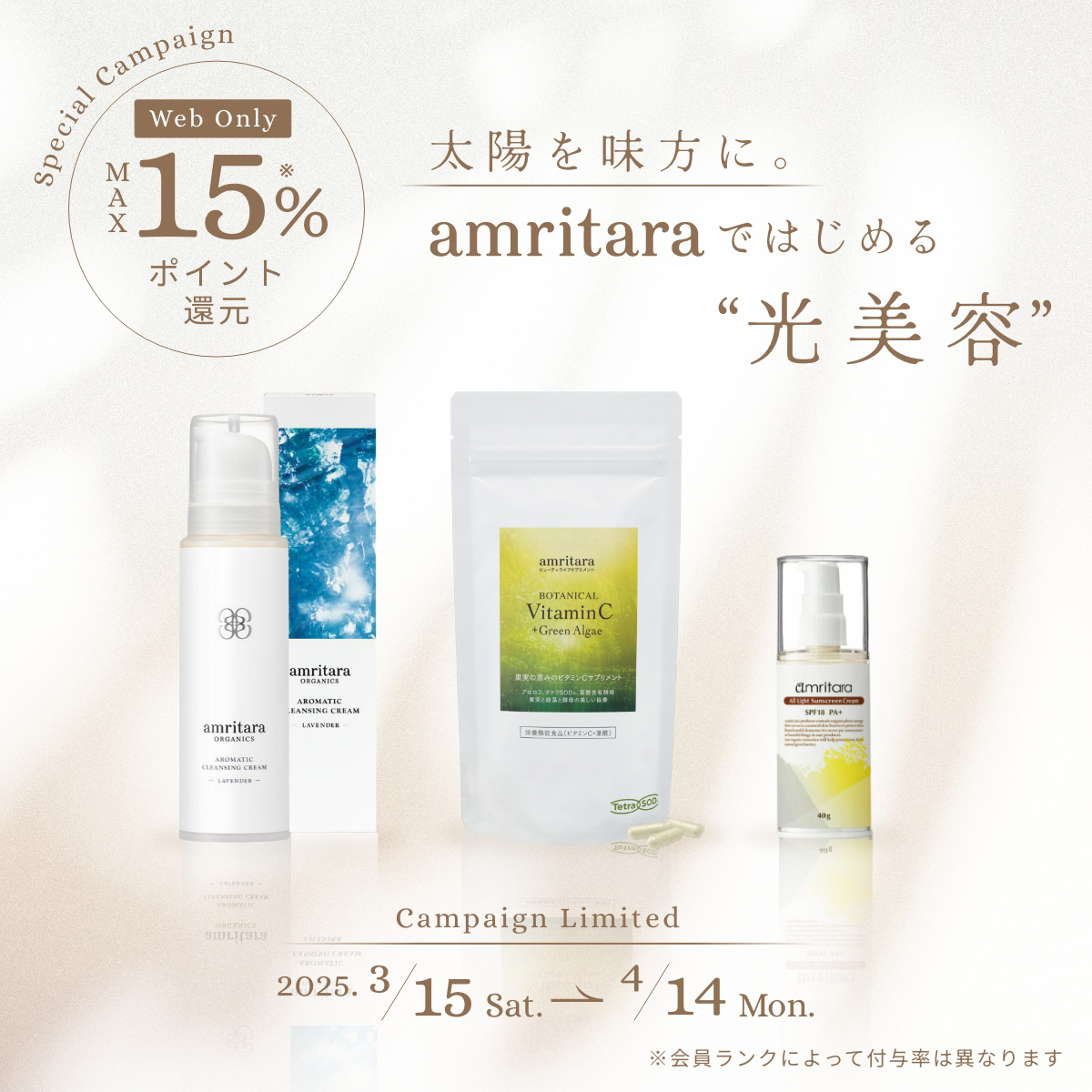 #1 About amritara #2 Beauty Q&A #3 PICK UP #4 SPECIAL 美容の情報があふれる今、 「自分に合うケア」がわからない—— 正解が見えず、迷子になっていませんか? “アンチエイジングの鬼”こと、 amritara代表・勝田小百合さんに、 今日から始められる肌と体の整え方を 聞いてみました。 これを読めば、脱・美容迷子! #1 Aboutamritara #2 BeautyQ&A #3 PICK UP #4 SPECIAL #1 About amritara ”アンチエイジングの鬼”こと勝田小百合先生。 アムリターラは創業18年目の国産オーガニックブランドです。ストイックなまでに研ぎ澄まされた全成分が特徴で、ゆらぎケアと同時にエイジングケア*を叶えることが出来ます。内なる美のみなもとである、美しさを引き出そうとする力自然治癒力を高めることで自分史上一番の魅力を引き出していきます。「アムリターラ沼」とも言われるこのフィトエナジーの世界へどうぞはまってみて下さい! *年齢に応じたハリを与えるケア 株式会社AMRITARA 代表兼商品開発 勝田小百合 オーガニックに生きる amritaraはCosme Kitchenが最初にセレクトした国産のスキンケアブランド。 あえて商品にはオーガニック認証を取らず、独自の厳しい自社基準「10の約束」を守りながら、真のオーガニックコスメ&サプリメントを作り出している“コアオーガニックブランド”です。 エイジングケア*×敏感ケアを同時に叶えるamritaraを、是非体感ください。 *年齢に応じたハリを与えるケア アムリターラの自慢は“全成分” 九州の自社農園をはじめ、長年農薬を使わずに頑張る農家様が育てたもの、日本各地から選りすぐった、元気で栄養価の高いオーガニックの原料を積極的に使用しています。 地域ならではの特産品を用いることで生産を守り、地域振興にもつなげています。 #2 Beauty Q&A SKINCARE Q1 基本的なスキンケアの順番は? 「水分が多いもののあとに、油分の含まれるもの」というのが基本のセオリー。でも油分が含まれていても「モリンガシードオイルセラム」のように乳化作用があるものは化粧水前のブースターに使用出来る場合もあります。 WEB STAFFおすすめアイテム 美容液だけでなくブースターとしても!初めてのオイル美容におすすめ モリンガシードオイルセラム ¥5,940 tax in BUY 数量限定 VIEW MORE Q2 スキンケアはとにかくたくさん重ねると効果がある? 季節や肌質や肌状態に応じて、使用量は調整しましょう。真冬や肌が乾燥している時は多め、真夏や皮脂が多い場合は油分のあるアイテムは少なめ等。春や秋、生理前などのゆらぎ時期は自分の肌をよく観察しながら量を調整下さい。 WEB STAFFおすすめアイテム シンプルな成分なのに高保湿!潤い抱え込む瑞々しい肌へ ホワイトバーチ モイスト ウォーター ¥4,620 tax in BUY ホワイトバーチモイストウォーター スターターセット ¥4,840 tax in BUY 数量限定ボトルつき VIEW MORE Q3 朝の洗顔はするべき? 朝は、睡眠中に出た汗や皮脂などもあるので、必ず洗顔しましょう。洗顔料は季節や自分の肌の状態に合わせて選んで下さい。乾燥肌の方はソープはTゾーンだけに使用したり、朝も「アロマティッククレンジングクリーム」を使用してもいいですね。 WEB STAFFおすすめアイテム 洗顔から保湿まで、約5日間ラインでお試し プレミアムトライアルセット ¥3,850 tax in BUY 数量限定 ゆらぎ肌を整え、潤いを守りながらメイクを落とす アロマティック クレンジング クリーム ラベンダー 150g ¥4,950 tax in BUY 忙しい朝も、濃密な泡洗顔でスッキリ洗い上げ クリーミー ホイップソープ ¥3,520 tax in BUY VIEW MORE Q4 化粧前のスキンケアはどうすればいい? Tゾーンは皮脂が多めなのでテカりやすく、頬骨の上は紫外線があたりやすく乾燥しやすいので、化粧水以降のスキンケアは、まず頬骨の上からつけ、Tゾーンは少なめにするのがお薦めです。 VIEW MORE Q5 日焼け止めは夏以外も必要? 量の差はあれど紫外線は1年中降り注いでいますし、ブルーライトなどはPCやスマホからも肌にあたります。日焼けせずとも、こうした光は真皮に少しずつダメージを与えるので、夏以外も日焼け止めをつけることをお薦めします。 WEB STAFFおすすめアイテム ブルーライトカット率97%*!瑞々しく、白浮きしないUVクリーム オールライトサンスクリーンクリーム SPF29 PA+++ ¥4,620 tax in BUY ブルーライトカット率95.9%*!メイクの仕上げとしても使えるUVパウダー オールライトサンスクリーンパウダーレフィル ¥3,960 tax in BUY * 原料メーカー調べ。カット率:製品をガラス片に厚み20μm塗布し、分光光度計でブルーライト(波長380-500nm)の透過率(%)を測定し、100から引いた数値。透過率が最も高い500nmでのカット率を掲載。 VIEW MORE Q6 エイジングケアは何歳から始めるのがベスト? 肌のエイジング、特に「光老化」という真皮へのダメージは10代から始まっているので、エイジングケアを意識するのに早すぎるということはありません。20代からハリや弾力の低下が始まり、30代からシミやくすみが出やすくなるので、10代20代前半は「きちんと洗う&光から守るケア」をメイン、2