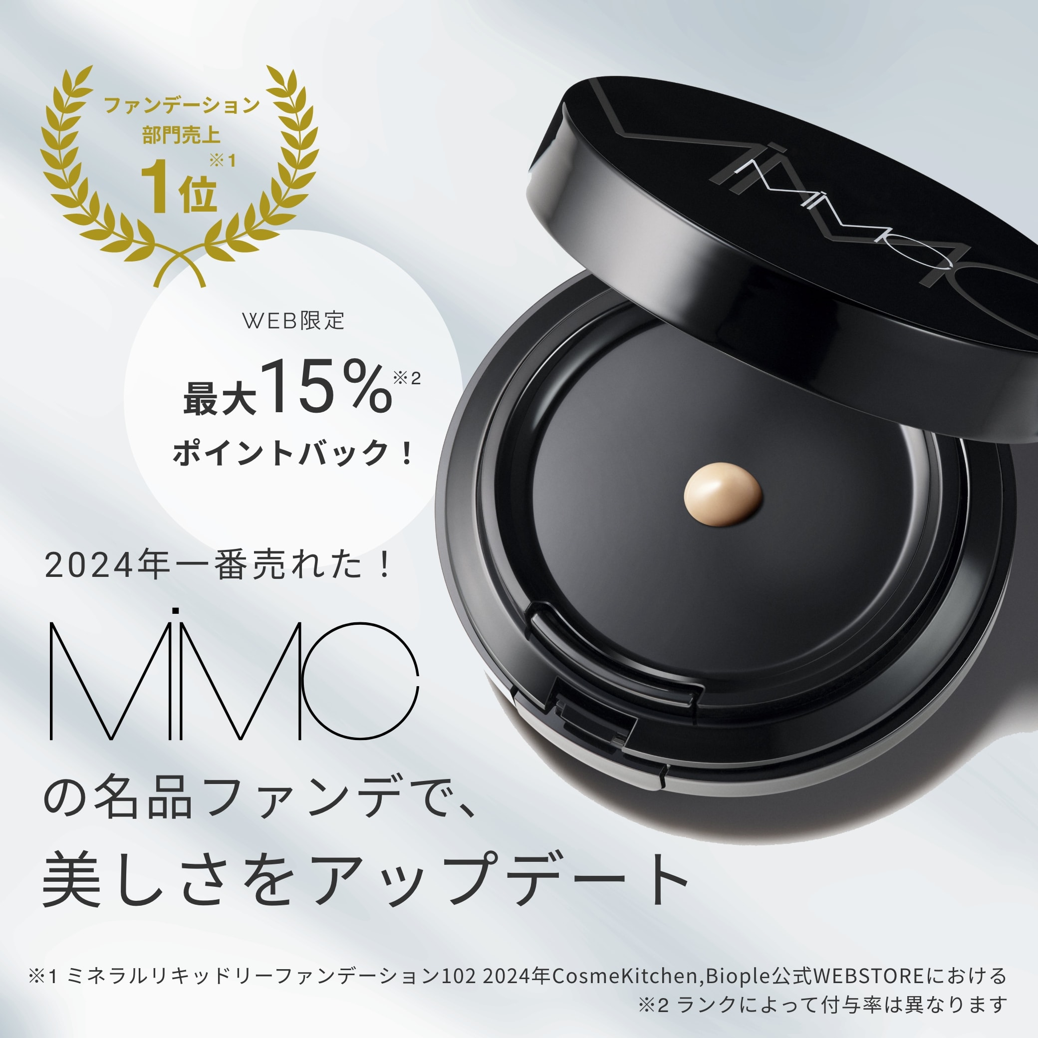 About MiMC BEST SELLER PICK UP RANKING About MiMC BEST SELLER PICK UP RANKING SPECIAL CAMPAIGN CHECK ALL ITEMS WEB限定SPECIAL CAMPAIGN 3/20まで CAMPAIGN.1 MiMC製品ご購入で 最大15%ポイントバック!※3 CAMPAIGN.2 MiMC製品含む8,800円(税込)以上 のご購入で “オメガフレッシュモイストソープ(ミニサイズ)” プレゼント!※4 キャンペーン対象アイテムを見る ※3 ランクによって付与率は異なります※4 なくなり次第終了です 今も未来も。美しさを起動し続ける肌へ MiMCは、「自然の力で本来の輝きを引き出す」をコンセプトに、 ひとりの女性科学者によって誕生したコスメブランド。 化学物質過敏症とアトピーを経験した開発者が、 自分のような女性でも輝けるアイテムを作りたいと 2007年にスタートしました。 自然の恵みを最大限生かし、 トレンド感溢れる美しいカラーリングや テクスチャーのプロダクトを開発しています。 BEST SELLER 素肌を思わせる「自然な透明感」と「艶肌」へ CosmeKitchen2024年上半期ベストコスメ ベースメイク部門3位 2024年ファンデーション部門売上1位※5 ※5 ミネラルリキッドリーファンデーション1022024年CosmeKitchen,BiopleWEBSTOREにおける ミネラルリキッドリーファンデーション Refillリフィル ミネラルリキッドリーファンデーションリフィル<全5色> ¥6,050tax in BUY Caseケース ミネラルリキッドリーファンデーションケース ¥1,100tax in BUY 今だけ MiMC製品含む8,800円(税込)以上 のご購入で “オメガフレッシュモイストソープ(ミニサイズ)” プレゼント!※4 キャンペーン対象アイテムを見る ※4 なくなり次第終了です REVIEW 自分史上最高のファンデ、且つ自分史上1番のリピート率。 ここ数年、このファンデに出会ってからはこれ一筋です。伸びもよく吸着感もよく、カバー力もそこそこよく、それでいて美容液を塗ってるような柔らかさと肌へのノーダメージ感。夜まで化粧をオフしなくても、肌が全く嫌がらないのです。これを超えるものが出てくるまではこれからもずっとリピします。 ポコ ケースと一緒に購入しました。人生コスメと言ってもいいくらい気に入っています!石鹸落ちで適度なカバー力と、なんと言ってもツヤ感が美しすぎます。化粧しています!っていう主張はあまりなく、ナチュラルな印象の肌に仕上げてくれます。無くなったらすぐに買いたいお気に入り商品です、おすすめです。 やっち STAFF REVIEW PICK UP 輝きながら目元に潤いを与えるモイスチュアアイシャドー 37 memories ミスティベージュ×ソフトブラウン ¥4,180tax in BUY 33 プラーナフロー ラベンダーブルー×シルキーブラウン ¥4,180tax in BUY 35 ヴィジョナリー シアーピンク×シアーオレンジ ¥4,180tax in BUY 29 ガイア イエロー×テラコッタブラウン ¥4,180tax in BUY 06 ムーンニンフ ベージュラメ×ブラウン ¥4,180tax in BUY 26 ワイルドライフ ベージュピンク×ソフトブラウン ¥4,180tax in BUY 27 ビバ オレンジ×マットレッド ¥4,180tax in BUY POINT POINT.1 輝きの美しいミネラルを美容成分でプレスト POINT.2 フルーツオイルで保湿&エイジングケア※6 オリーブ ローズヒップ アサイヤシ ※6 年齢に応じたケア STAFF REVIEW 保湿 or サラっとあなたはどっち派? 質感チェンジを楽しむ2つのベースメイクをCosmeKitchenスタッフ KUROがご紹介! 保湿 サラっと 肌に優しく、しっかり保湿 メイク中もスキンケア!高保湿ベースメイクといえばこの組み合わせ!うるしとすべすべ肌を叶える肌環境快適ベース。目元のベースにリキッドリーシャドーを忍ばせて目元にもいたわりを。26番のシャドーはナチュラルなのに華やかさも! 使ったアイテムはこちら リフィル ミネラルリキッドリーファンデーション リフィル 205 ¥6,050tax in ケース ミネラルリキッドリーファンデーション ケース ¥1,100tax in モイスチュアシルク ¥5,720tax in ビオモイスチュアシャドー 26 ワイルドライフ ¥4,180tax in ミネラルリキッドリーシャドー 02 デイオブライト ¥3,630tax in 春メイクでお出かけしよう! リキッドリーファンデーションの水面のようなつやめきにアースコントロールクリアパウダーのサラっとした頼もしいキープ力で、思いのままの質感に。春のうららかな陽射しのようなアイカラーをまとって、一足先に春を感じるメイクに! 使ったアイテムはこちら リフィル ミネラルリキッドリーファンデーション リフィル 102 ¥6,050tax in ケース ミネラルリキッドリーファンデーション ケース ¥1,100tax in アーストーンコントロール クリアパウダー リフィル ¥4,180tax in ビオモイスチュアシャドー 35 ビジョナリー ¥4,180tax in RANKING 1 【MiMC】ミネラルリキッドリーファンデーション リフィル スポンジ付・SPF22 PA++<全5色>102 ニュートラル ¥6,050 (tax in) 2 【MiMC】ミネラルリキッドリーファンデーション リフィル スポンジ付・SPF22 PA++<全5色>205 ピンクブライト ¥6,050 (tax in) 3 【MiMC】ミネラルリキッドリーファンデーション リフィル スポンジ付・SPF22 PA++<全5色>103 ベージュ ¥6,050 (tax in) 4 【MiMC】ミネラルアイブロー<全3色>02 ナチュラルブラウン ¥2,530 (tax in) 5 【MiMC】ビューティービオフ