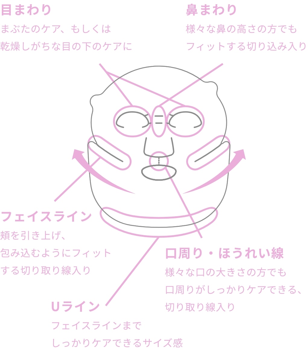 1. 洗顔後、ローションで肌を整え、シートマスクを取り出し、目と口の位置を合わせ、頬を包み固定します。