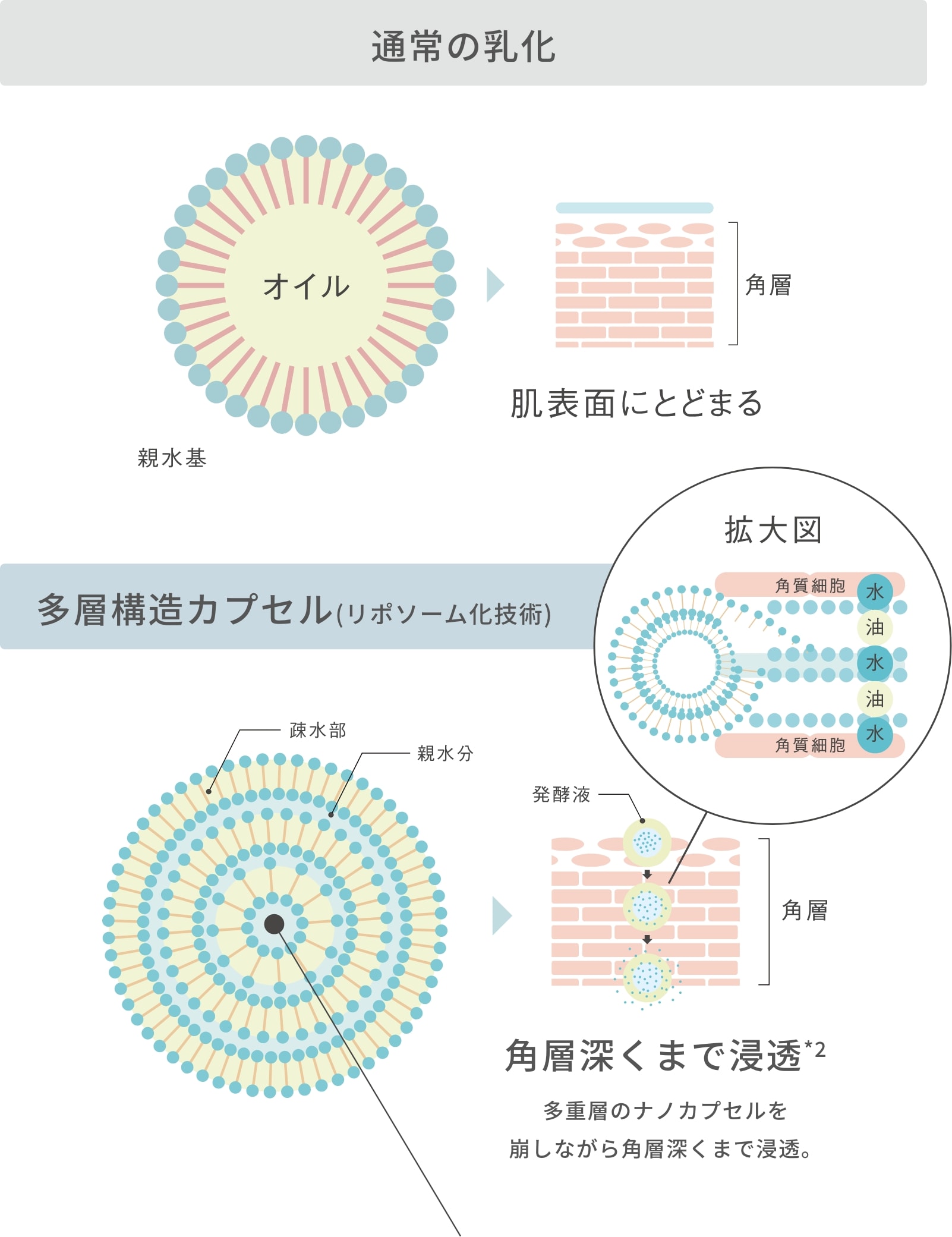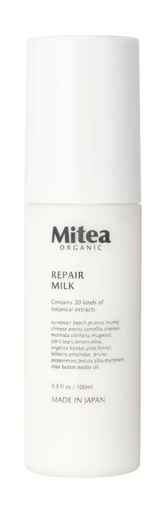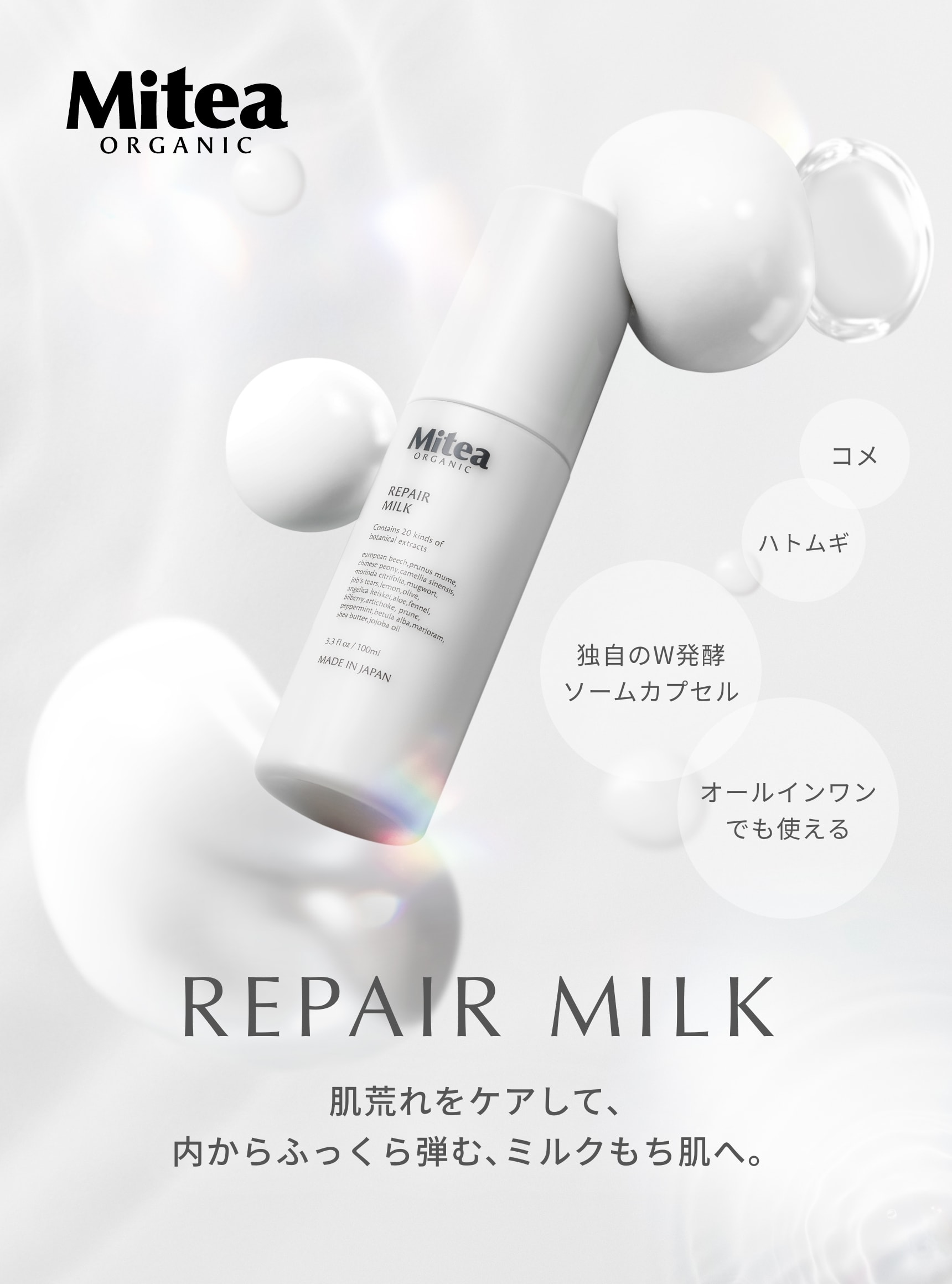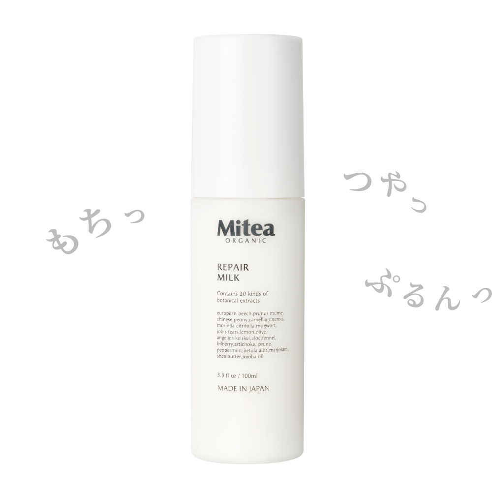 オールインワンでも使える、「水」と「オイル」にこだわったから、 初の「乳液」が新登場。 荒れた肌にも独自のW発酵ソームカプセルが角層深くまで浸透。ハリ・透明感※1のある肌へ。 「水」と「オイル」をそのまままっすぐに届けることに こだわったMitea ORGANICが、肌荒れ予防のために開発した 「W発酵ソームカプセル」技術。 一般的にリポソーム化技術といわれる 多層構造カプセルの中に、 コメとハトムギをはじめとした 植物の恵みの発酵成分を閉じ込めました。 角層深くまでじわじわと浸透※2させながら、 美しい生まれ変わりをサポートしていく独自の特殊設計。 肌の水分と油分をつくりだすための発酵液が 角層深くの肌荒れのもと※3をケアしながら、 肌表面もうるおいで満たすミルクが完成しました。 この1品でなめらかでみずみずしい、 ふっくらと厚みのあるミルクもちのような肌に。 もちろん 、ローションで肌を整えてから 使うとより、よりふっくら、みずみずしく。 どんなときも、わたしが整う “肌のお守りミルク”が誕生します。 W発酵ソームカプセルハリ・うるおい透明感※1オールインワンケア肌荒れケア Mitea ORGANIC リペアミルク 100mL ¥1,991 tax in ウッディラベンダーの香り / 2~3か月 DETAIL BUY NOW TOPICS 慢性的な肌荒れ人口が増えている? 温暖化による暑さや気温差、大気汚染や花粉、ブルーライトなど外的な肌ストレスはもちろん、働き方の多様化やライススタイルの変化などによる内的ストレス。 また、美容医療が身近になり、ホームケアでもパワフルなコスメを使う方が増え、肌の負担が大きくなっている可能性があります。 内外的な様々な要因で、赤みや乾燥、キメの乱れなど慢性的な肌荒れに悩む方が少なくありません。 肌表面だけでなく、「ラメラ構造」も乱れている? 肌荒れが表面的なダメージだけではなく、角質層の水分と油分のバランスを構成する「ラメラ構造」まで崩れていることで、水分と油分をしっかり与えても肌荒れが改善しない状態に。 「ラメラ構造」が乱れることで、バリア機能が低下し、表皮も外的刺激を受けやすく、乾燥や、くすみ・ハリの低下など肌荒れだけ なく、老化も誘引します。 「表皮」と「ラメラ構造」の双方にアプローチする肌荒れケアが大切。 FORMULA が独自開発した、W発酵ソームカプセルが角層深く※2から肌荒れにアプローチ。 一般的な乳液の役割は肌の表面に皮膚になじみやすい薄い膜を作って、うるおいを閉じ込めること。 Miteaは一般的にリポソーム技術といわれる多層構造のカプセルの中にナノサイズ化した植物発酵エキスを閉じ込めたカプセルを独自に開発。 発酵により、ナノサイズまで微粒子化した発酵液を多層構造のカプセルで角層深く※2まで届けながら、オイルでの閉じ込めも行います。 「肌表面」と「ラメラ構造」、双方に働きかけることで、荒れた肌でも、1品だけのお手入れも可能。 ふっくらと厚みのある、みずみずしいうるおいをつくります。 足りないところに、深く、じっくりと。内から肌をうるおす、植物発酵エキスの力。 発酵させることにより成分が小さく分解されるため、ナノサイズのカプセルの中にも発酵液を閉じ込めることが可能に。 油分のもと コメ発酵液※4 肌の油分のもと「セラミド」の産生を健やかに保つことにフォーカス。 水分のもと コメ発ハトムギ種子発酵液※5 肌の水分のもと天然保湿因子「NMF」の産生をサポート。 油分のもと ネムリペア発酵液※6 睡眠中に肌状態をメンテナンスするホルモン「メラトニン」の発現に着目。バリア機 能をサポートし、肌の油分に働きかける。 水分のもと デイリリー花発酵液※7 有機栽培されたユリ科の酵母発酵液。ヒアルロン酸などの分解をセーブし、肌の水分に働きかける。 FEATURE リペアミルクだからこそ実現した独自の美容成分や使い心地 POINT 1 肌表面のキメを整え、肌荒れ・透明感※1・ハリに働きかける 肌表面のキメを整え、透明感※1のある肌に 肌荒れ・保湿 ツボクサ(CICA)※8 ツボクサエキスとも呼ばれるハーブの1種。乾燥や敏感に傾きやすい肌を整える保湿・整肌成分。 透明感※1・毛穴 ビタミンC誘導体※9 植物性持続型ビタミンCを採用。透明感*¹のある毛穴の気にならない肌へ整えます。 肌荒れ・キメ グリチルリチン酸ジカリウム※10 肌荒れを予防し、みずみずしくすこやかな肌状態に整える整肌成分。 POINT 2 肌のハリとうるおいを生みだす厳選のオーガニック植物成分 オーガニックブナエキス※11 オーガニックウメ果実エキス オーガニックシャクヤク根エキス オーガニックチャ葉エキス オーガニックヨモギ葉エキス + and more POINT 3 みずみずしくなじんでスッと浸透※2。ふっくら厚みのある、みずみずしいテクスチャー。 肌の負担になりにくい植物由来の界面活性剤を使用。 みずみずしくなめらかなテクスチャーで、伸び良く広がり、スッと浸透※2。 べたつかず、肌表面はしっとり。 後肌はもっちりふっくらと整います。 POINT 4 自分と向き