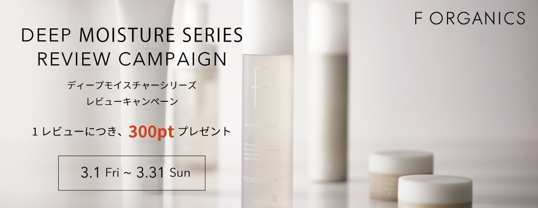 「F ORGANICS WEBSTORE」、「Cosme Kitchen WEBSTORE」「Biople WEBSTORE」「Make up Kitchen WEBSTORE」でF ORGANICSのディープモイスチャーシリーズをご購入頂いたお客様を対象に、キャンペーン期間中に商品レビューを投稿していただくと、1レビューにつき300ポイントプレゼント!