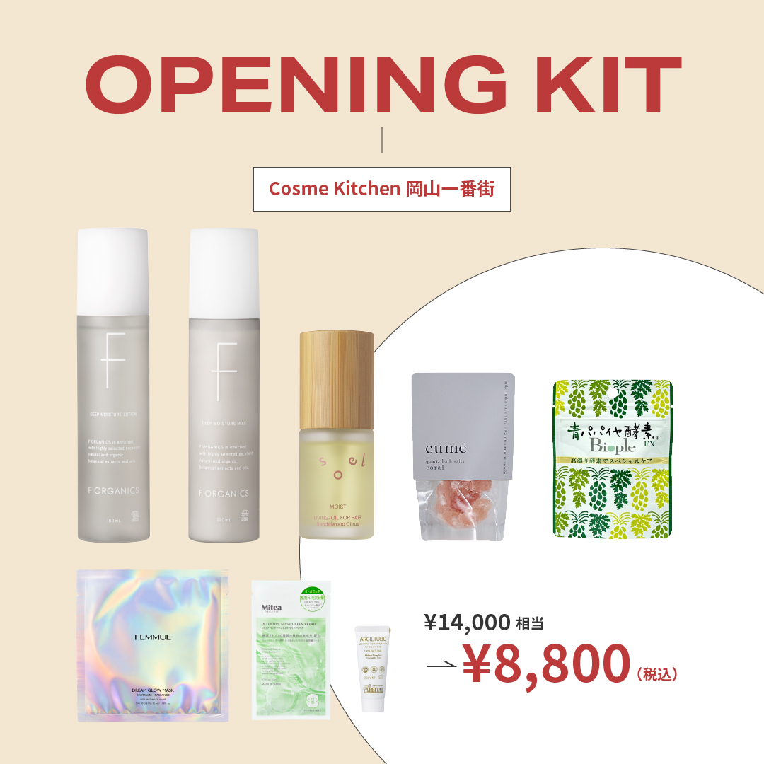 Cosme Kitchen岡山一番街店のリニューアルオープンを記念して、Cosme Kitchenで愛されるスキンケアからインナーケアアイテムまで揃えたトータルビューティーを叶える、お得な限定キット。