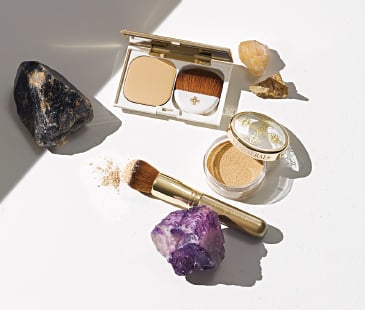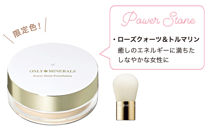 厳選されたミネラル100%のファンデに、現代社会でがんばる女性を応援するジェムストーンを配合。なりたいイメージに合わせて選んで。