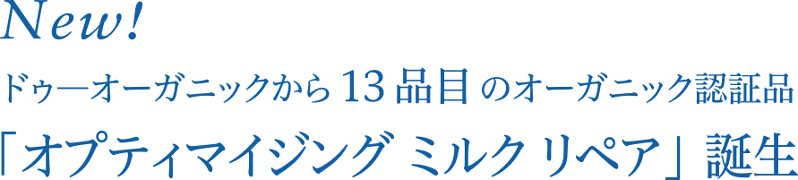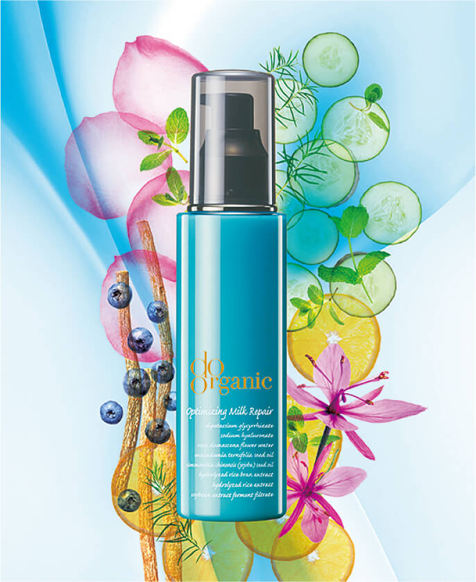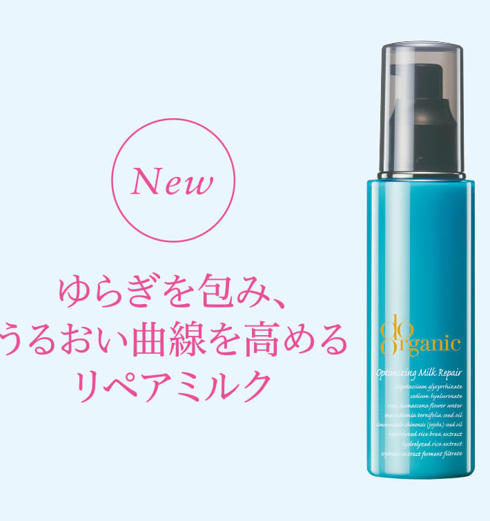 ブランドデビュー11年目を迎えるドゥーオーガニックから13品目のオーガニック認証品として、オーガニック認証の新規準「COSMOS ORGANIC」を取得した、春夏のゆらぎ肌のための新乳液「オプティマイジング ミルク リペア」が誕生。 鮮やかなラグーンカラーのリペアシリーズは、四季のある日本生まれのオーガニックコスメだからこそ、春夏に起こりやすい肌ゆらぎのケアとエイジングケア※1がダブルでできるシーズナルライン。同シリーズのエクストラクト ローション リペアとこのミルクを合わせて使えば、よりインナードライ※2やテカリケアがしっかりとでき、ベストコンディションの肌へ。花粉が気になる春も紫外線がふりそそぐ夏も、ポジティブに過ごすための1本です。 ※1 年齢に応じた化粧品によるお手入れ