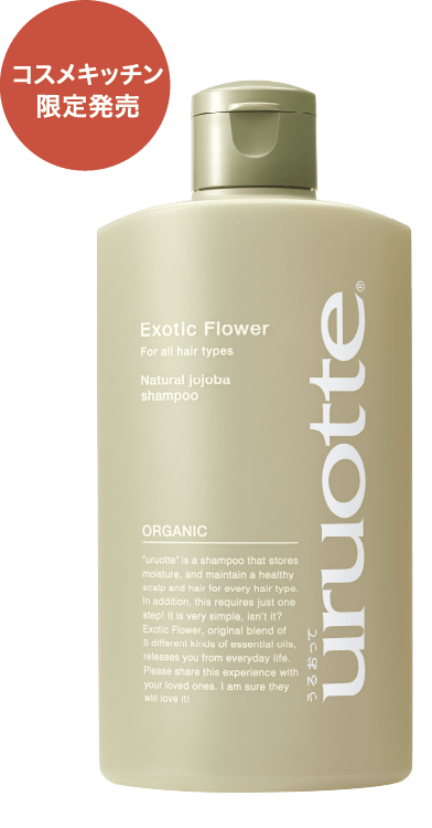 今や亜熱帯のような高温多湿、日本の夏は頭皮にもかなりのストレスをもたらしているはず。だから秋はシャンプーも存分にこだわりたい。例えば日本発信のロングセラー、オーガニックの名品、ウルオッテのナチュラルシャンプー。今回コスメキッチンとのコラボが実現した。敏感な頭皮もやさしく潤す働きが人気だけれど、そこに何とも言えないリゾートの地に咲き乱れる花々のようなエキゾチックフラワーの香りのオリジナルが一品加わったのだ。18種類の植物エキスがしっとりと洗い上げ、シャンプーだけでもハッとするほどのツヤやコシが生まれるのも嬉しい。