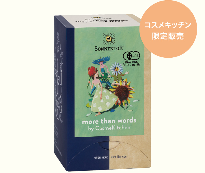 ハーブティーが苦手な方でも親しめるティー。ハイビスカス、エルダーベリー、カモミール、エーデルワイス、リンデンの5つの花々の力を享受するように、美味しく飲んで体に取り込んで。炭酸水、ヨーグルトとも相性Good!