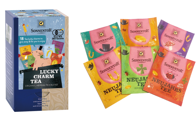 エルダーフラワーやスペアミントが爽やかに香るハーブティー。ヨーロッパに古くから伝わる6つのラッキーチャームがティーバッグに描かれています。一杯飲むたび、幸運が舞い込む予感!