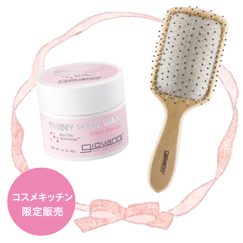 頭皮を優しくマッサージできるブラシは、小回りの利くミニサイズがうれしい。濡れ髪スタイリングも可能なワックスはやさしくチェリーブロッサムが香り、髪の毛以外にリップやお肌にも使用可能なマルチユースワックス!