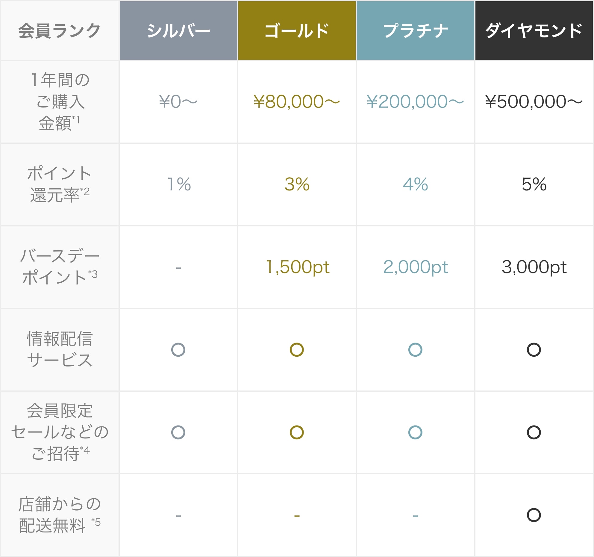 対象ブランド & over 30 brands 全ブランドを見る \お買い物が楽しくなる!/MAポイントの貯め方 貯め方1 日々のお買い物で1~5%貯まる 会員ランクに応じてポイント付与率がアップします。マッシュグループの店舗、オフィシャルECサイト、USAGI ONLINEでポイントが貯まります。(一部対象外) 会員ランクについて詳しく見る \お買い物が楽しくなる!/毎月のポイントアップデーで ポイントUP *予告なく変更する場合がありますのでご了承ください 月に2回のポイント5倍デー ポイント+5%デー MA CARD会員になってポイントを貯める! 貯め方2 アクションに基づいてポイントが貯まる! 新規会員登録 500Pt 3カ月連続購入 200Pt 同ブランド店舗×EC購入 100Pt ファッション×ビューティー 100Pt ファッション×フード 100Pt ビューティー×フード 100Pt 同ブランドの店舗、オフィシャルECサイトどちらもお買い物をしていただくとさらに100ポイントが付与されたり、アクションに基づきポイントを獲得することができます。*条件あり アクションは今後も拡大予定です。 *予告なく変更する場合がありますのでご了承ください 貯め方3 レビュー投稿で30ポイントプレゼント! レビューを投稿すると通常30ポイントプレゼント。レビュー投稿キャンペーンではもっとポイントがもらえることも! 対象サイト:Cosme Kitchen、Biople、SNIDEL BEAUTY、Celvoke、F ORGANICS、to/one 貯め方4 バースデーポイントプレゼント! お誕生月に利用できるバースデーポイントをプレゼント。会員登録のメールアドレス宛にお届けします。 ※生年月日のお誕生月をバースデーポイントの対象とさせていただきます。※お誕生月限定のポイントになるため、翌月にはポイントが消滅いたします。 会員ランクについて詳しく見る MA CARD会員になってポイントを貯める! マッシュグループブランドリスト FASHION BEAUTY FOOD&OTHERS FASHION BEAUTY FOOD&OTHERS ※ 一部対象外店舗あり ※ gelato pique cafeは三井アウトレットパーク 北陸小矢部店のみ対象です。 MAポイントとは \お買い物が楽しくなる!/MAポイントの貯め方 ご購入金額によって会員ランクアップ 毎月1日を基準に過去1年間のご購入金額で会員ランクを毎月更新!たくさん購入した翌月にはランクアップのチャンスがあります。 会員ランクがアップすると、ポイント付与率や特典がグレードアップされます。 ランクごとのサービス一覧 *1 毎月1日を基準に過去1年間のご購入金額(税込)で算出します。オンラインストアの場合、配送料・各種手数料はご購入金額の対象外となります。会員ランクの更新は毎月1日朝8時頃までに反映されます。反映前にご購入いただいた場合は、前月会員ランクのポイント還元率でポイントが付与されます。 *2 ポイントはご購入金額(税抜)で算出します。 *3 バースデーポイントはお誕生月限定ポイントとなり、お誕生日前月の月末までに付与し、お誕生日月の月末で失効となります。バースデーポイントはお誕生日前月の会員ランクに応じて付与しております。 *4 会員登録日によって、会員限定セールの対象外となる場合がございます。 *5 国内のみ(離島は対象外)一部対象外ブランド、店舗、商品がございます。店舗での1回の購入金額5,500円(税込)以上で1住所にご利用いただけます。店舗ご購入時もしくは店舗への電話注文(代金引換)の商品が対象となります。 会員ランクの更新 毎月1日を基準に過去1年間のご購入金額で会員ランクを毎月更新!たくさん購入した翌月にはランクアップのチャンスがあります。毎月1回会員ランクの更新を行います。 ※会員統合後の初回会員ランク更新は2022年7月1日となります。