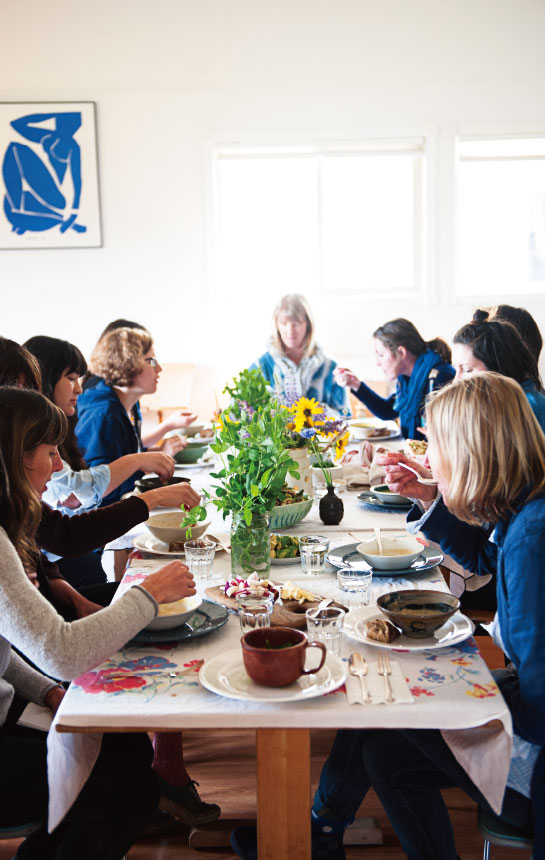 自然と同様、人との繋がりも大切にするふたり。「ホームパーティを開くときは、来客全員に自宅 のようにくつろいでもらえるよう心掛けているわ。 (サラ)」「ケイト(Alima Pure創設者)から教わっ た方法ですが、ゲストとのコミュニケーションを重視するため、手間のかかりすぎる料理はしません。ホストがキッチンに閉じこもっていたら、せっかくのパーティが台無し。お鍋ひとつでできる料理をひとつふたつと、パンやチーズ、サラダなどを用意すれば十分。ゲストも気を使わずに済むし、ゆっくりとおしゃべりを楽しめます。(アリソン)」