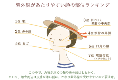 私が光老化を防ぐためにやっていることはいろいろあるのですが、まず紫外線量の多い10時から14時に外出する時は、ツバが「10cm以上」の帽子をかぶること。夏はこの時間帯以外でも常にキャップをかぶっています。こうするとこれだけで、実は顔の70%はカバー出来ちゃうのです。