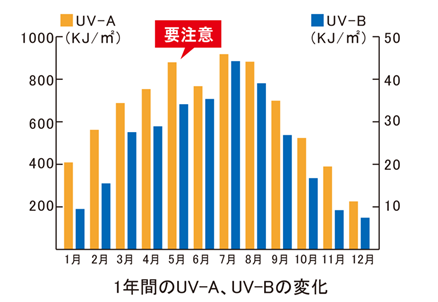 グラフを見ると分かるように、UV-Aの影響は3月くらいから注意が必要で、5月のUV-A量は8月とそう変わりません。UV-Aは窓ガラスも雲も通り抜けてくるので要注意です。