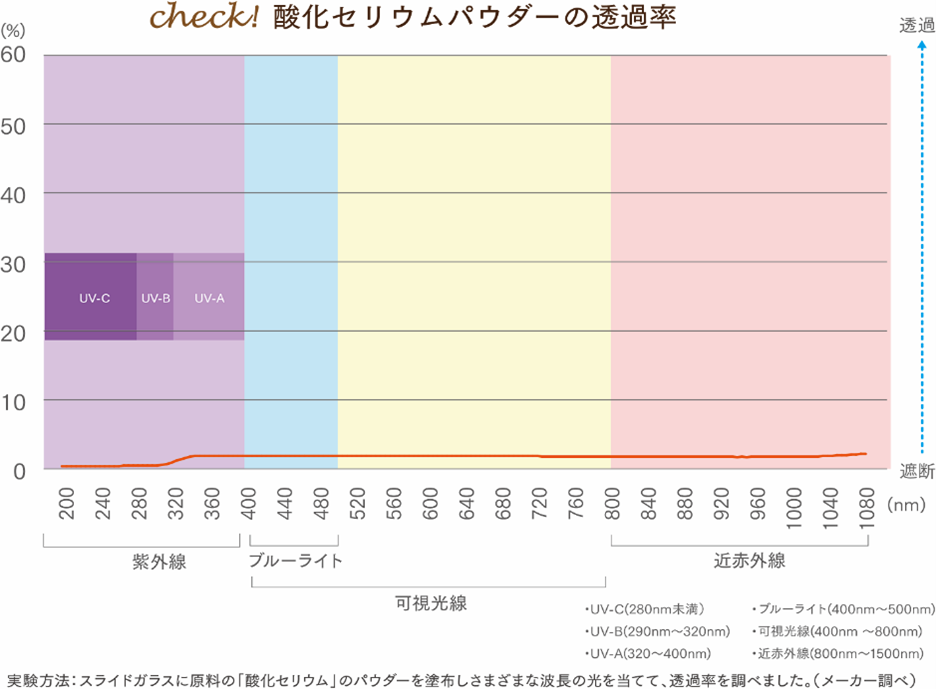 セリウムがすごいのは、ナノ粒子にしなくても紫外線だけでなくブルーライトや近赤外線の一部まで反射できることと、チタンや亜鉛ほど白くないので大きい粒子でも白浮きしないこと。もう1つすごいのは、それなのに光活性がほとんどないので活性酸素で肌を傷める心配がないこと。更に最高にすごいのが、酸化したものを元に戻す還元力があることです。