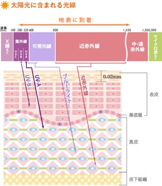 私たちの目に色として見える「可視光線」には、紫、青、緑、黄、橙、赤などがあるのですが、その中の青い光「ブルーライト」は、肌に日焼けを起こすことこそ、ほとんどありませんが可視光線の中では紫外線に次いでエネルギーが強く、しかも真皮まで差し込んでいる長い波長なので、これまた長期的に見ると光老化の原因となります。