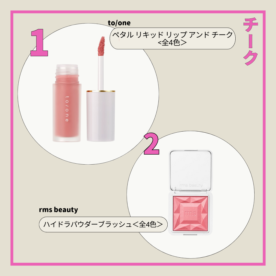 「水光肌に見せてくれるようなツヤと自然な血色感を出してくれます。チークはこちら一択!」