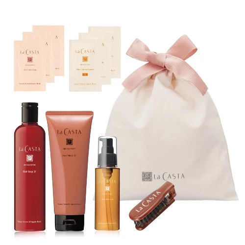 ラ・カスタオリジナル巾着に加え、アウトバスのサンプルセットと、持ち運びにも便利な折りたたみミニブラシもついてくるお得な限定キットです。
